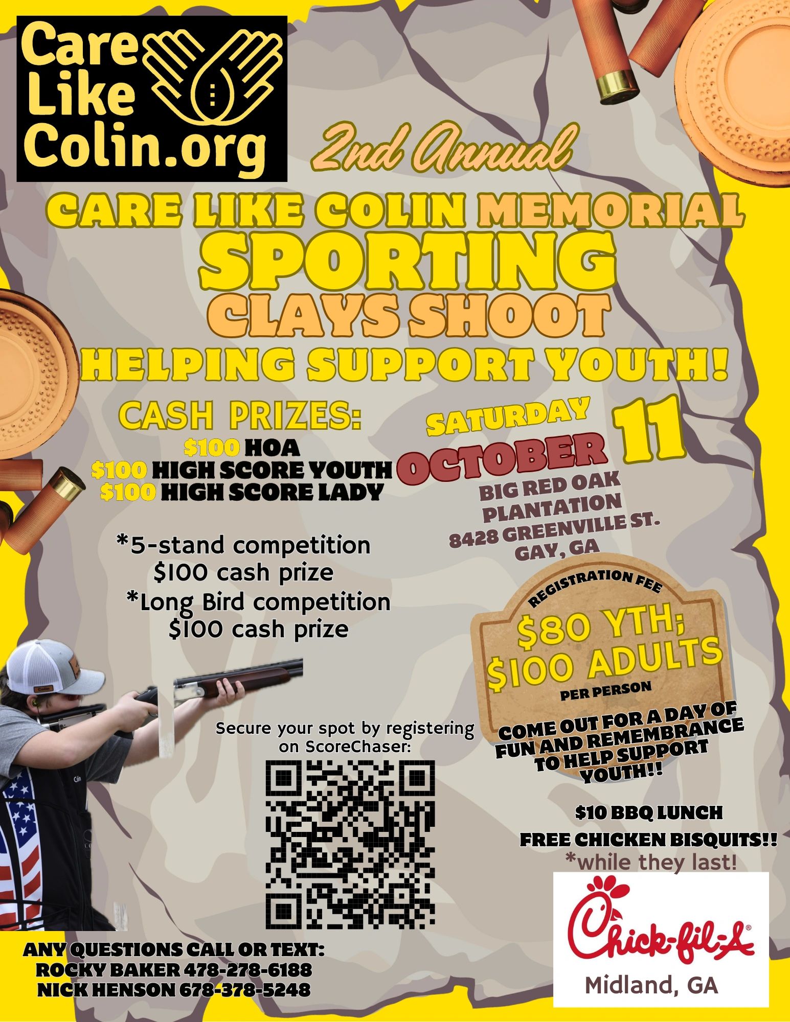Open Shoot times anytime between 9am and 3pm! Shooters can register online via Score Chaser (preferred) or in person on the day of the shoot. Registration opens at 8am. Pay online or in person (cash, check, CC, Venmo). Onsite $5 raffles!! $10 BBQ lunch. Email us at carelikecolin@gmail.com with any questions.